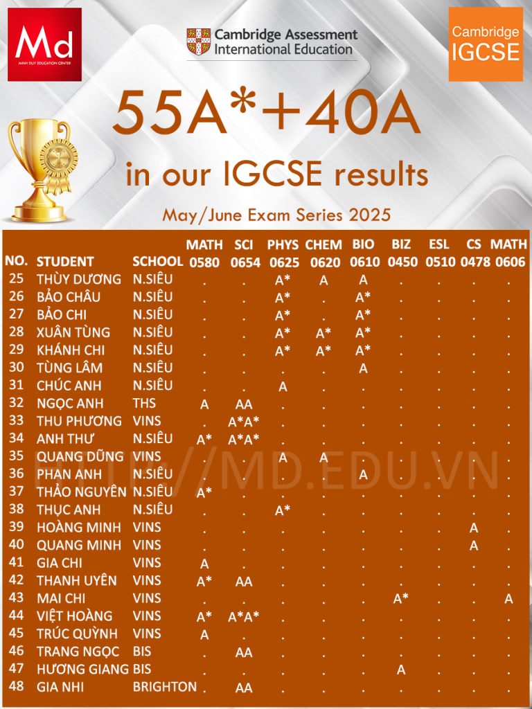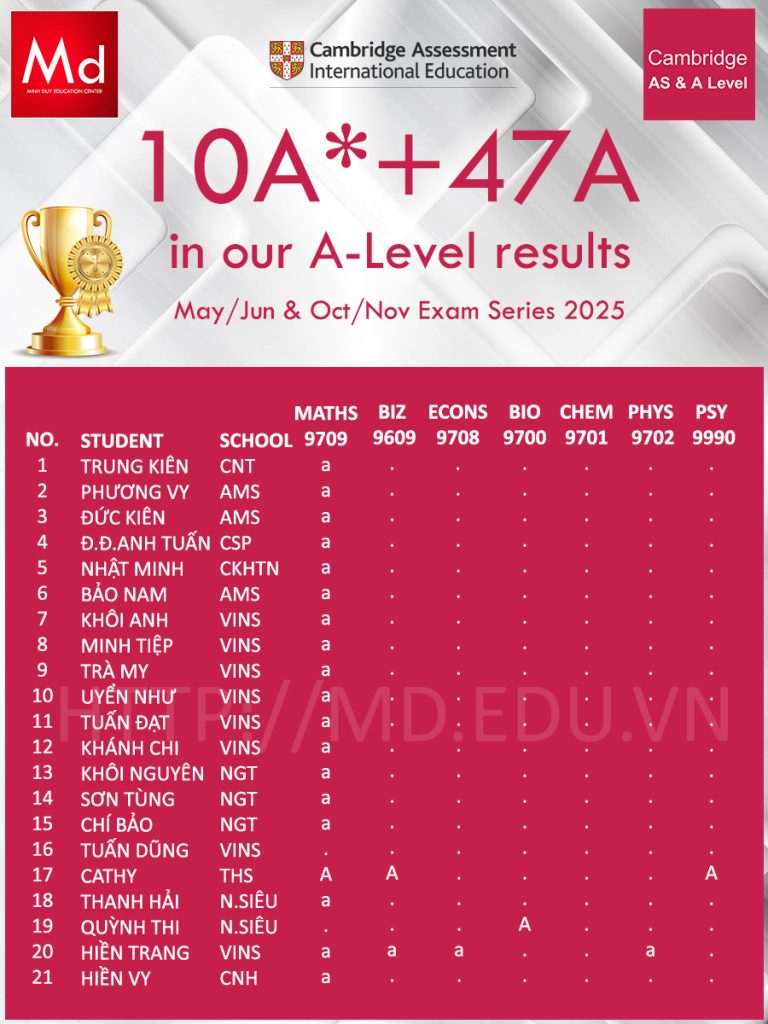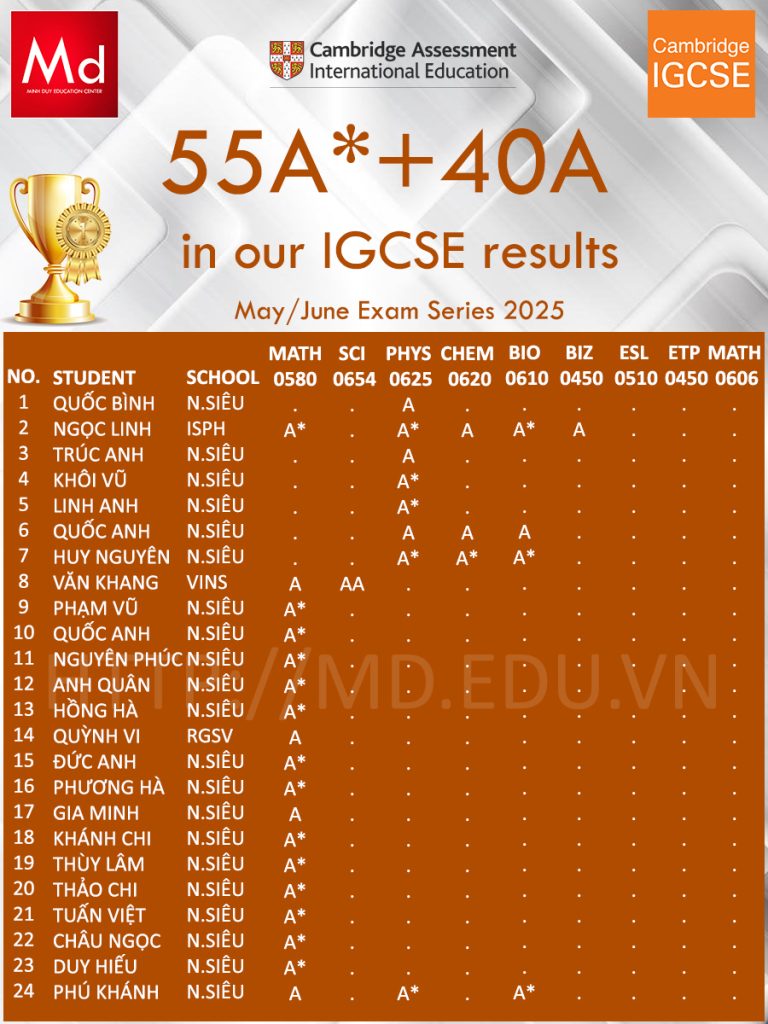 Thành tích đào tạo của bộ phận gia sư quốc tế Minh Duy Private Tuition, tiền thân của William Global Academy.