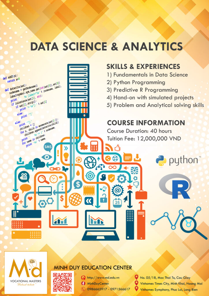 Mục tiêu chính của khóa học là trang bị các mảng kiến thức quan trọng và cơ bản nhất của Data Science và vận dụng vào các phân tích (Analytics) và thống kê (Statistics). Thông qua khóa học, học sinh sẽ được trang bị các kiến thức về phân loại và xử lý dữ liệu lớn, có được nền nền tảng kỹ năng về lập trình Python/ R để thực hiện các thuật toán cụ thể.